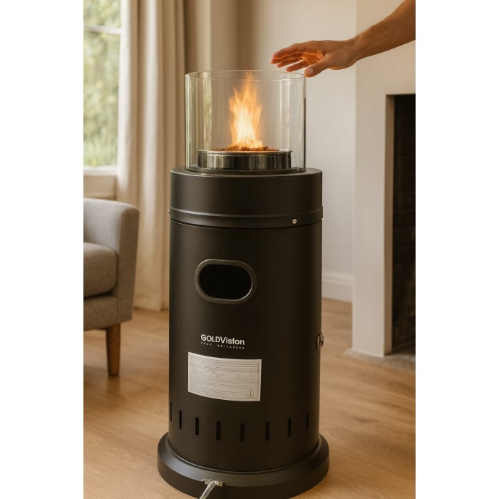 صوبة غاز أنيقة بتصميم أسطواني مميز، مغطاة باللون الأسود المطفي، ومزودة بوعاء زجاجي شفاف في الجزء العلوي لعرض اللهب بشكل جميل وآمن.