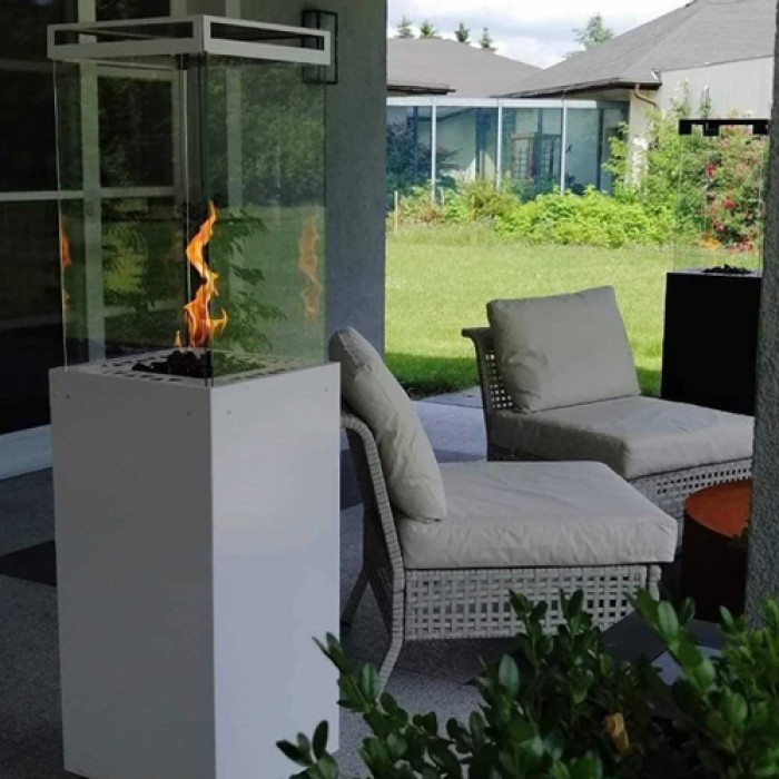 تصميم مربع حديث بزجاج شفاف يتيح رؤية اللهب من جميع الجهات.