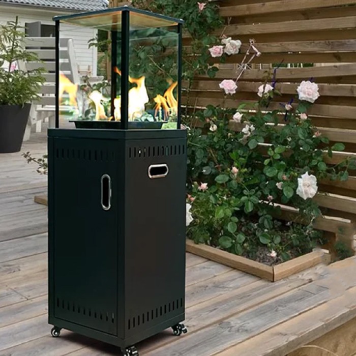 مدفأة غاز حديثة التصميم مخصصة للاستخدام الخارجي في الحدائق أو التراسات. تعمل بالغاز لتوفير الدفء والجو المريح في الأماكن المفتوحة.
