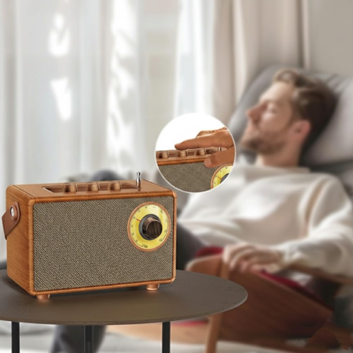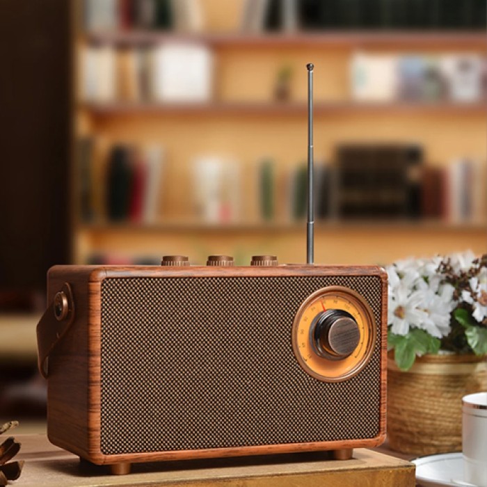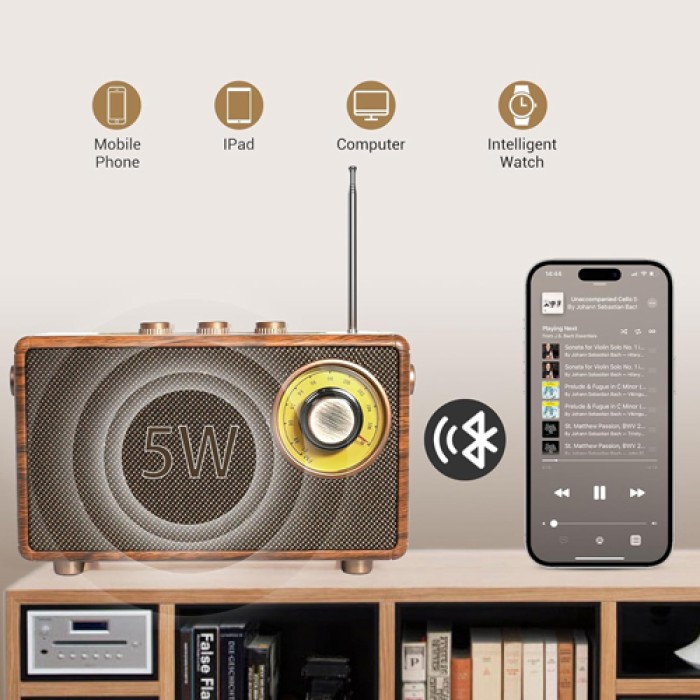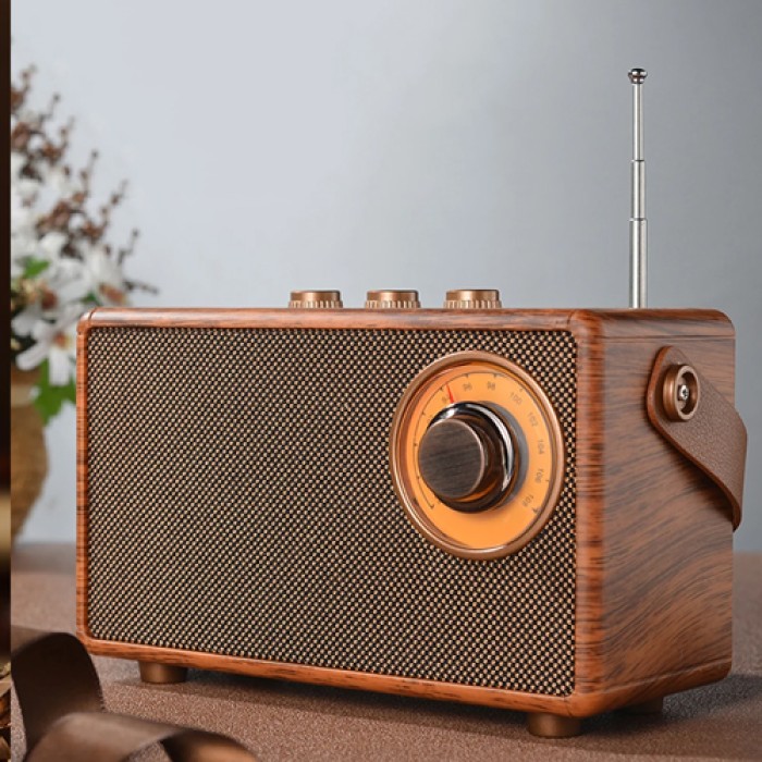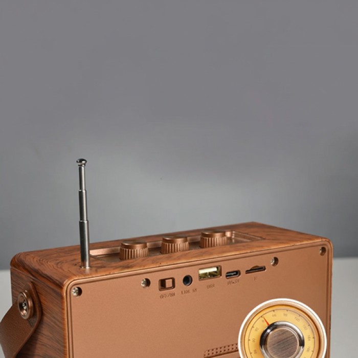 التصميم: تصميم كلاسيكي أنيق بتشطيب خشبي فاخر يمنحه طابعًا عتيقًا وجذابًا، مع أزرار تحكم معدنية ولمسات رجعية مستوحاة من الراديوهات القديمة.