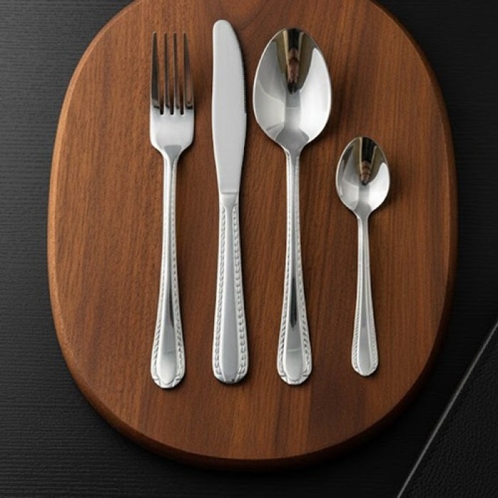طقم راقي من 24 قطعة من المعالق والشوك بتشطيب فضي أنيق، مناسب لجميع الوجبات اليومية والمناسبات الخاصة. مصنوع من ستانلس ستيل عالي الجودة مقاوم للصدأ، يتميز بتحمل الاستخدام المتكرر وتصميم كلاسيكي يلائم جميع أطقم السفرة.