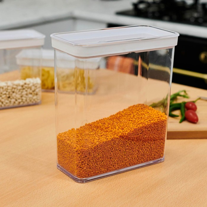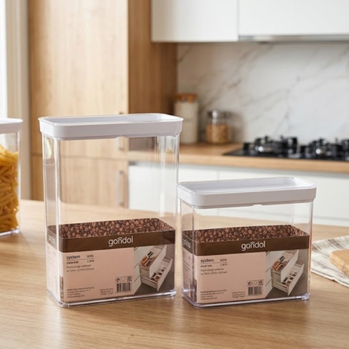 علبة حفظ بقوليات وأطعمة من الأكريليك بسعة 3.3 لتر من موديل GONDOL G695، بتصميم عملي مستطيل يساعد على ترتيب وتنظيم المطبخ بكفاءة. تتميز بغطاء محكم الإغلاق يحافظ على نضارة الطعام ويحميه من الهواء والرطوبة.