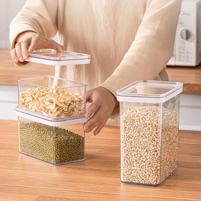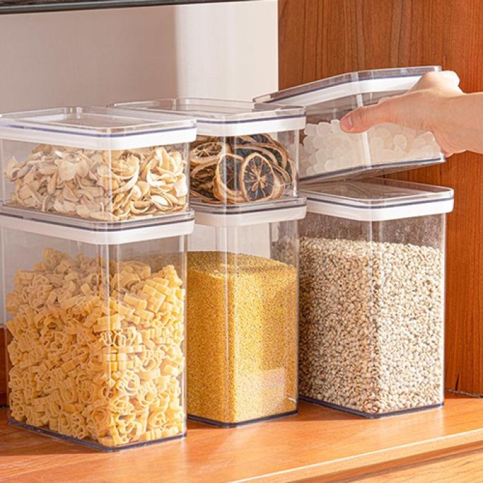 مصنوعة من بلاستيك عالي الجودة وآمن للاستخدام الغذائي، مع جسم شفاف يتيح رؤية المحتوى بسهولة دون الحاجة لفتح العلبة. مناسبة لتخزين البقوليات مثل العدس والحمص، بالإضافة إلى الأرز، السكر، المعكرونة، والحبوب المختلفة.