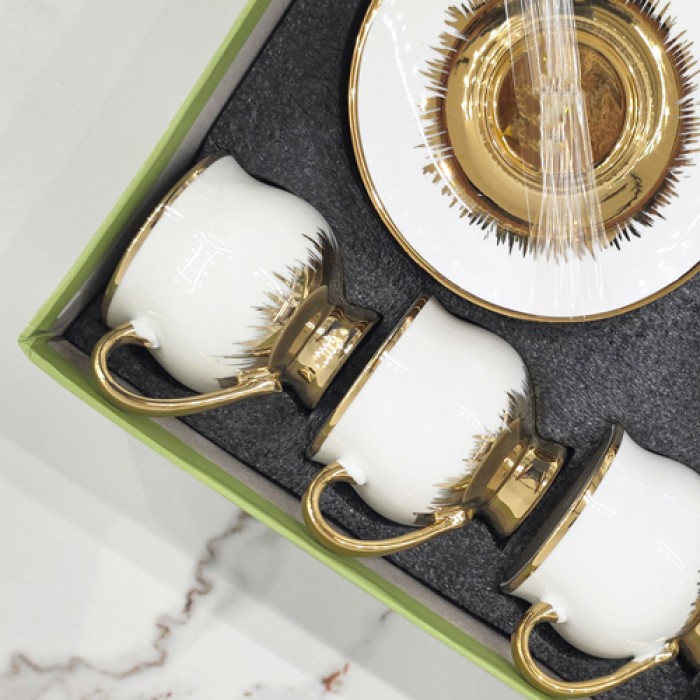 مصنوع من خامات عالية الجودة مثل البورسلان أو الزجاج، مما يمنحه متانة ولمعان يدوم طويلاً. يعد خيارًا رائعًا للاستخدام الشخصي أو كهدية أنيقة لمحبي القهوة والضيافة الفاخرة.