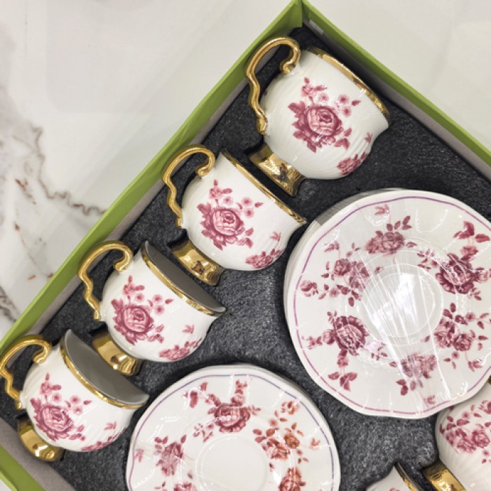 طقم فناجين قهوة عربي فاخر مكون من 12 فنجان بتصميم مورد أنيق ولمسات ذهبية راقية تضفي لمسة فخامة على جلسات الضيافة. يتميز الطقم بنقوش زهرية جذابة مع حواف مذهبة تعكس الذوق الكلاسيكي العصري، وهو مثالي لتقديم القهوة العربية أو التركية في المناسبات والاستقبال اليومي.