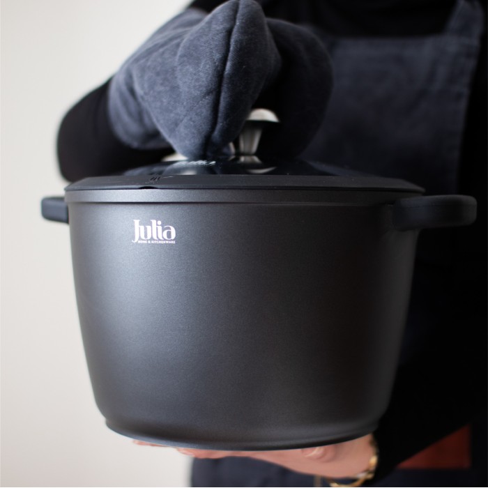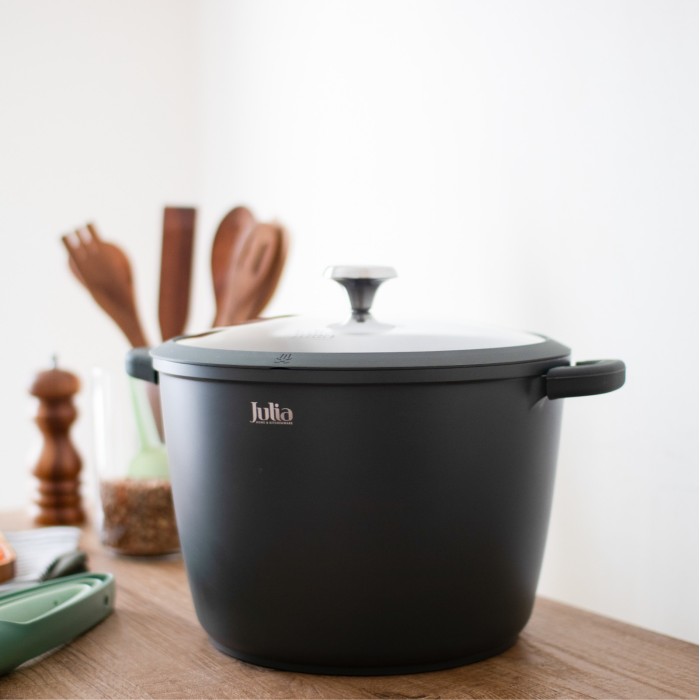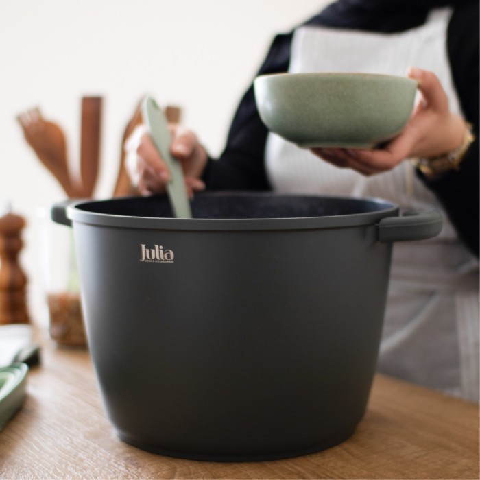 طنجرة عميقة وعملية بقطر 28 سم من مجموعة Julia Black، مثالية لتحضير كميات كبيرة من الأطعمة مثل الشوربات، اليخنات، المعكرونة، والأرز. تتميز بتصميم عصري باللون الأسود يضيف لمسة أنيقة لأي مطبخ.