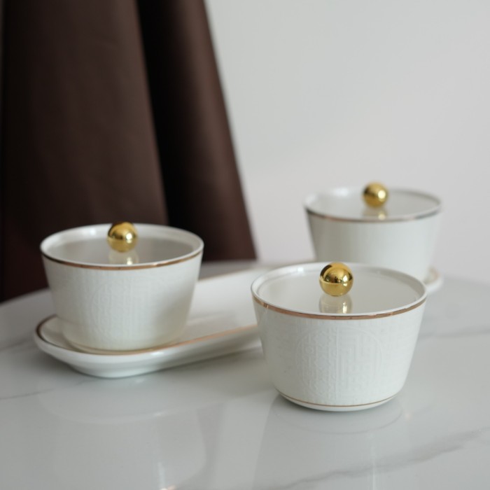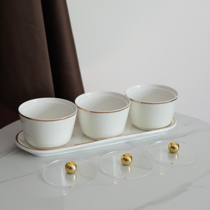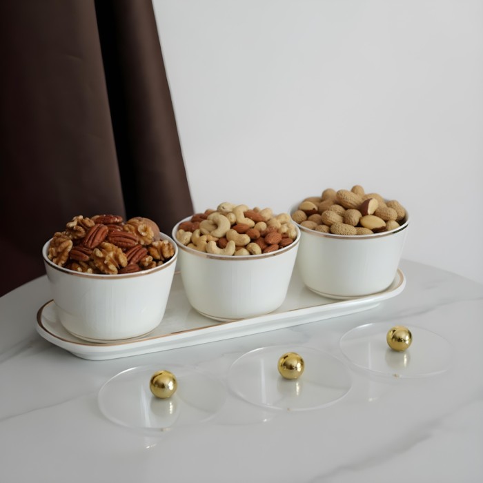 • طقم يحتوي على 3 أكواب لتقديم المكسرات مع حامل أنيق.