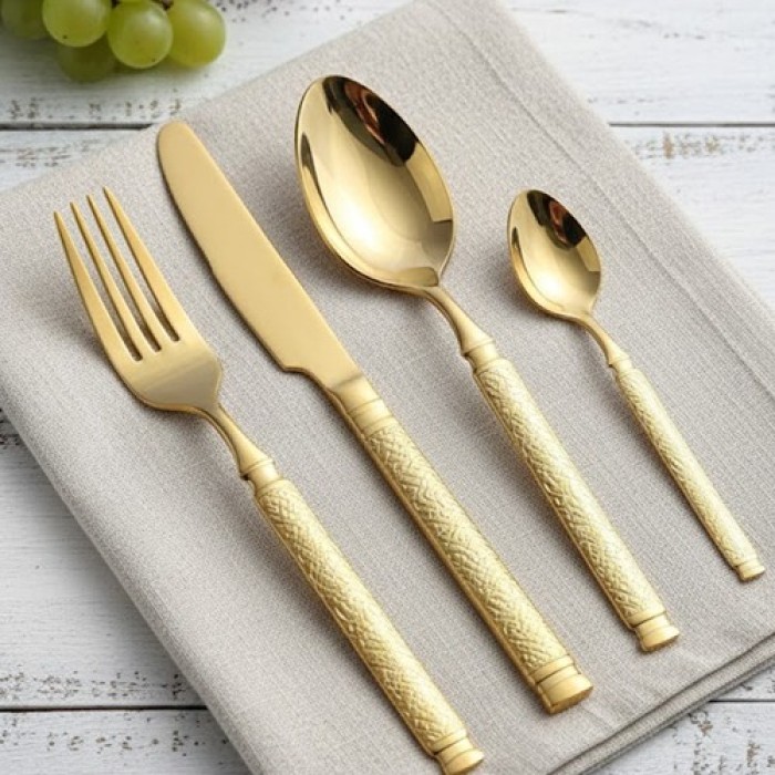طقم أنيق من 24 قطعة يتضمن معالق وشوك بتصميم ذهبي فاخر ومتين، مناسب لتقديم الطعام في المناسبات، وللاستخدام اليومي في المنزل. مصنوع من ستانلس ستيل عالي الجودة مع طبقة ذهبية لامعة تضفي لمسة فخامة على سفرتك.