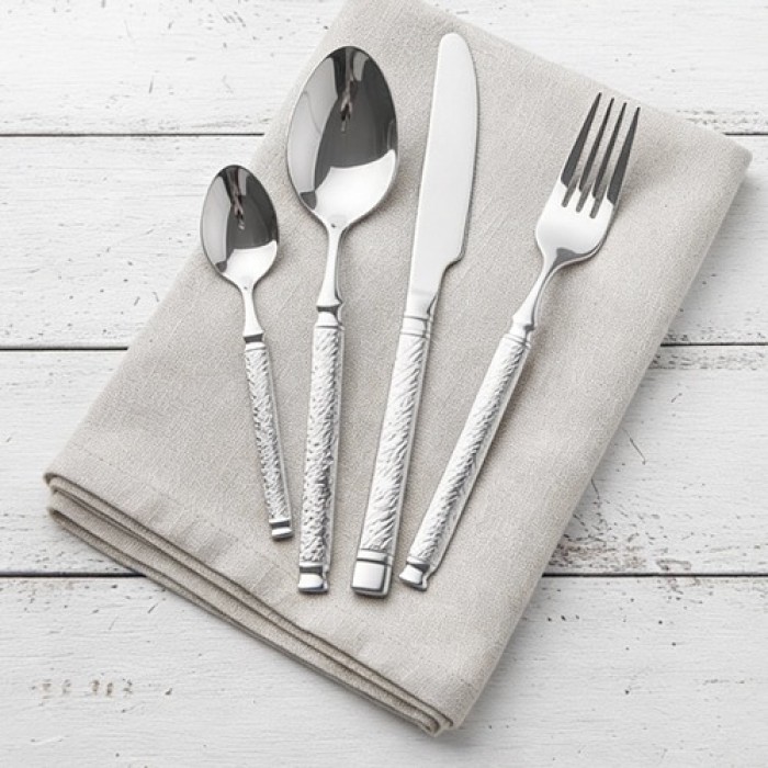 طقم راقي من 24 قطعة من المعالق والشوك بتشطيب فضي أنيق، مناسب لجميع الوجبات اليومية والمناسبات الخاصة. مصنوع من ستانلس ستيل عالي الجودة مقاوم للصدأ، يتميز بتحمل الاستخدام المتكرر وتصميم كلاسيكي يلائم جميع أطقم السفرة.