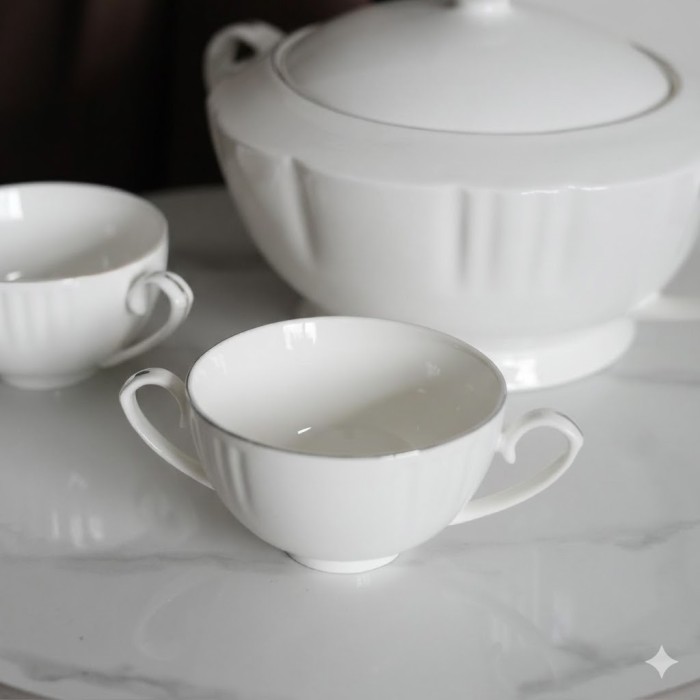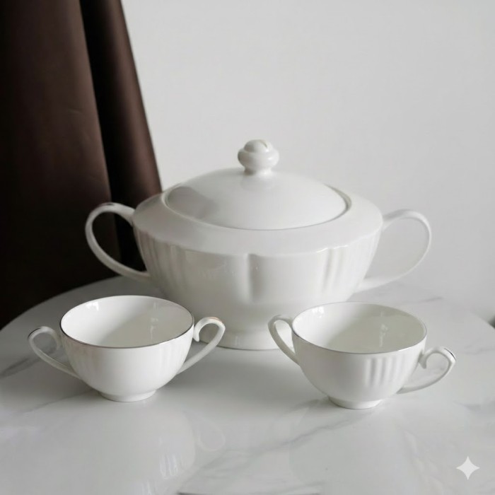طقم شوربة 8 قطع فضي – صوفيا 9259645 هو طقم تقديم أنيق ومتكامل مثالي لتقديم الشوربة والمأكولات الساخنة بطريقة راقية على مائدة الطعام. يتكون الطقم عادة من 8 قطع تشمل أوعية شوربة (مثل المجات والصحن الرئيسي) وقد يضم حامل أوستاند للمظهر المتناسق والتنظيم الجميل على الطاولة.