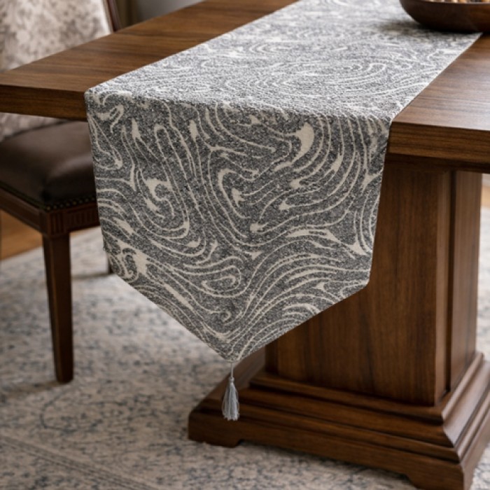 رنر طاولة أنيق مصنوع من قماش صوف عالي الجودة بنقشة موج مميزة، يضيف لمسة دافئة وعصرية إلى طاولة الطعام أو طاولة الضيافة. يتميز بتصميمه الأنيق الذي ينسجم بسهولة مع مختلف أنماط الديكور، مما يجعله مناسبًا للاستخدام اليومي أو للمناسبات الخاصة.