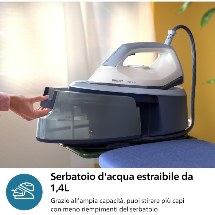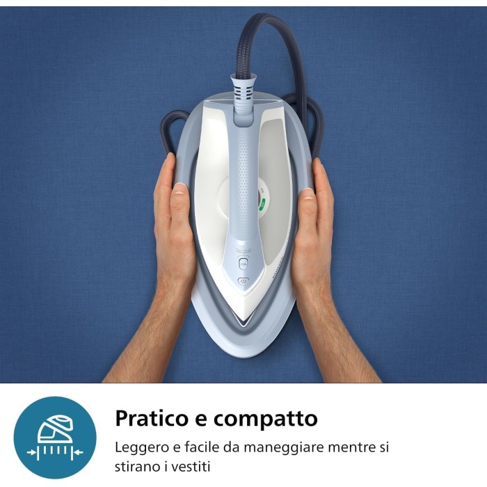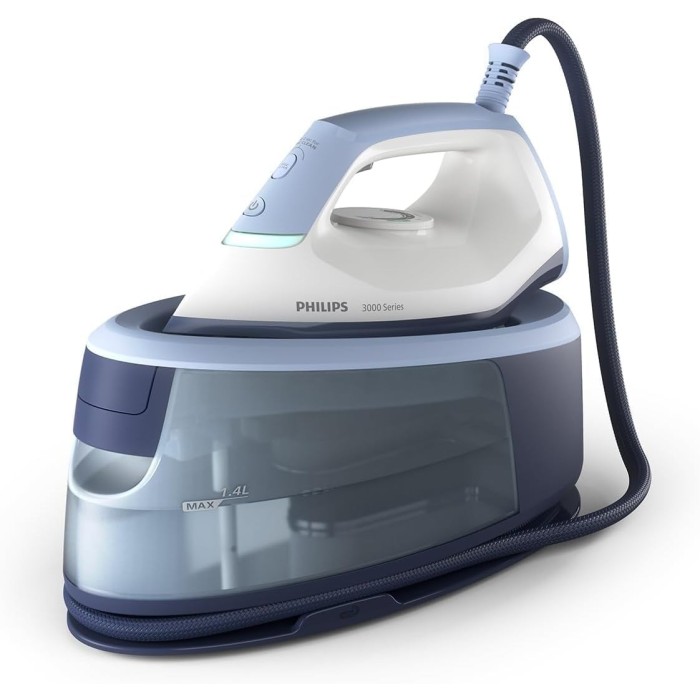 مكوى البخار Philips PSG3000 مصمم لتسهيل عملية الكوي بكفاءة وسرعة. بقدرة 2400 واط، يسخن بسرعة ويصدر بخارًا مستمرًا لإزالة التجاعيد بسهولة والحصول على ملابس ناعمة وخالية من التجاعيد.