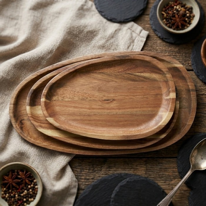 الخشب الطبيعي يمنح مظهرًا دافئًا وفخمًا على المائدة، مع سطح متين وسهل التنظيف، مما يجعله خيارًا مثاليًا لتقديم الفواكه، الحلويات، المقبلات أو حتى الأطباق الرئيسية.