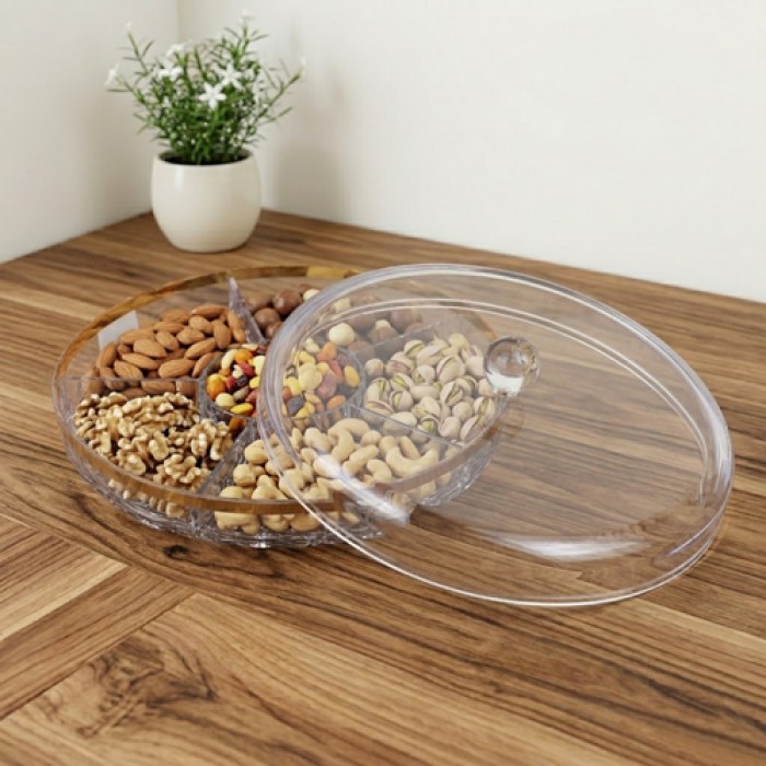 مضيفة أكريليك مقسمة بتصميم أنيق وعصري مزينة بحواف (زنار) باللون الذهبي، تضيف لمسة فخامة إلى طاولتك. تأتي بتقسيمات متعددة تساعد على تقديم المكسرات، الحلويات، التمر، أو المقبلات بشكل مرتب وجذاب. مصنوعة من خامة الأكريليك عالية الجودة، مما يجعلها خفيفة الوزن، متينة، وسهلة التنظيف. مناسبة للاستخدام اليومي أو في المناسبات والضيافة.