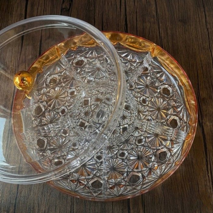 مضيفة أكريليك مقسمة إلى 12 قسم بتصميم أنيق مزين بزنار ذهبي فاخر، تمنح مائدة التقديم لمسة راقية وعصرية. تتيح التقسيمات المتعددة تقديم مجموعة متنوعة من المكسرات، الحلويات، التمر أو المقبلات بشكل منظم وجذاب. مصنوعة من أكريليك عالي الجودة، خفيفة الوزن ومتينة وسهلة التنظيف، مما يجعلها مثالية للاستخدام اليومي أو في المناسبات والضيافة.