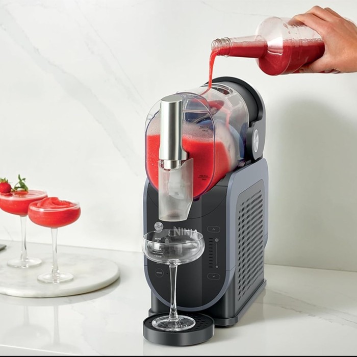 ماكينة السلاش NINJA Slushi FS301 بسعة 2.5 لتر هي جهاز احترافي لتحضير المشروبات المثلجة بسهولة في المنزل، حيث تقوم بتحويل أي مشروب إلى سلاش أو مشروب مجمد بدون الحاجة إلى ثلج أو خلط.